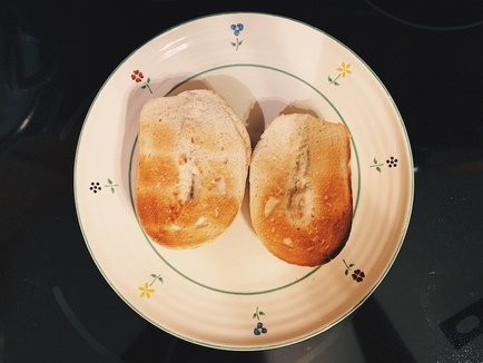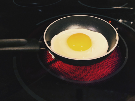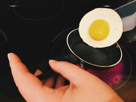 Remove your egg from heat, and dress up your bagel with items such as butter, cheese, and ham. Add egg to bagel.