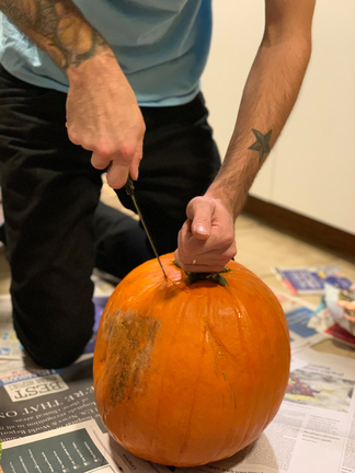 Cut a hole in the top with a large knife to get inside your pumpkin.