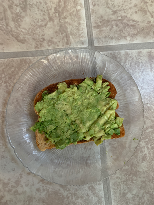 Take toast, put onto plate, and place/spread the avocado on top.