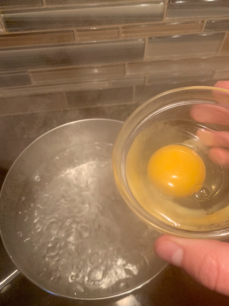 Take a pot, put heat on high, and boil 2 cups of water. Once boiling, crack the egg into the water. Leave in water for 3 to 7 minutes, depending on desired consistency of yolk.