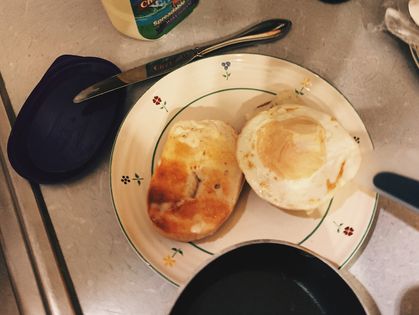 Remove your egg from heat, and dress up your bagel with items such as butter, cheese, and ham. Add egg to bagel.