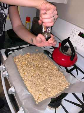 Pre-heat oven to 250 degrees. Line a baking sheet with parchment paper, drain and lay the seeds.